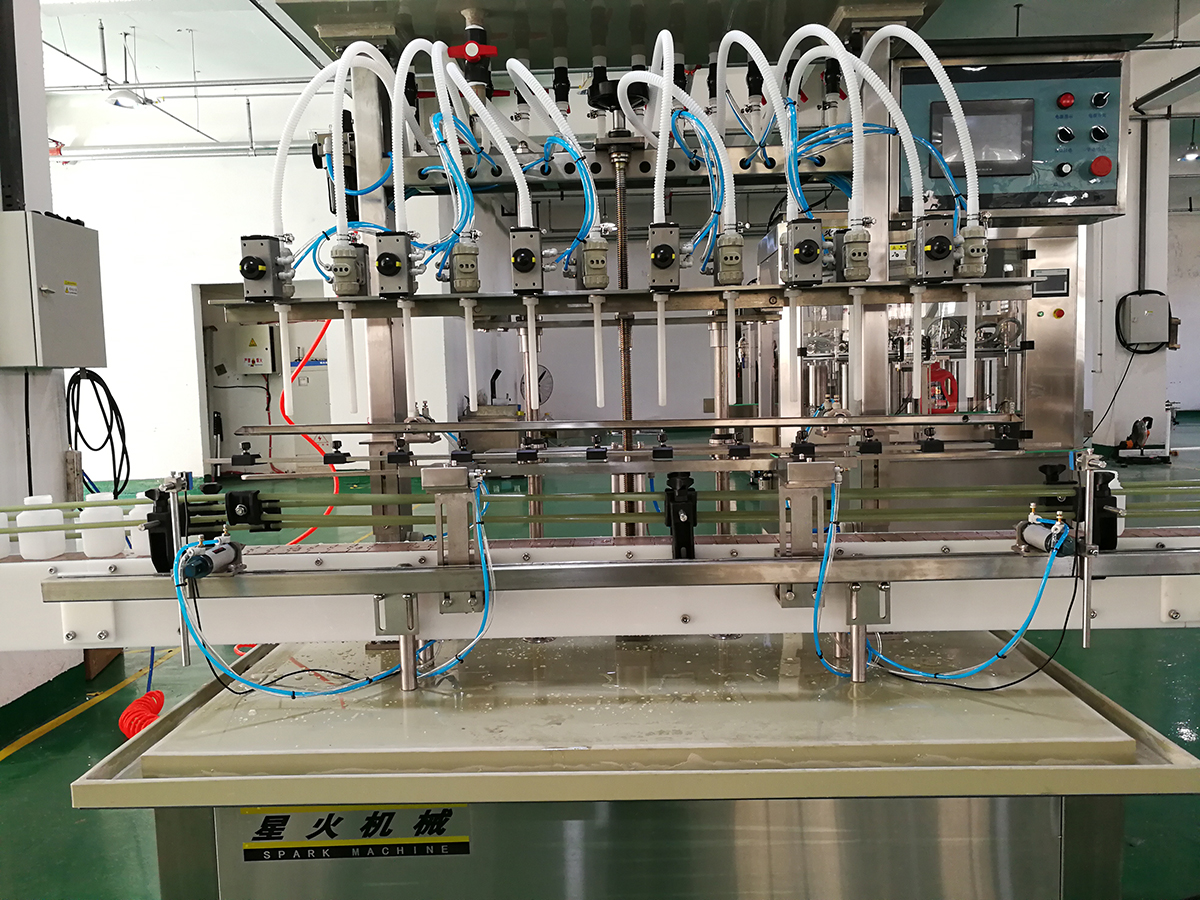 該機是一種由微電腦(PLC)可編程控制,光電傳感,氣動執行于一體的高新技術灌裝設備。本機專用于日化類,適用于84消毒液、潔廁劑、去污劑、鹽酸、腐蝕性化工產品等含有酸、堿、鹽等化工類液體的灌裝。