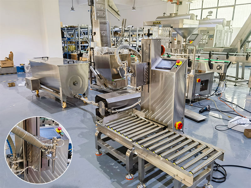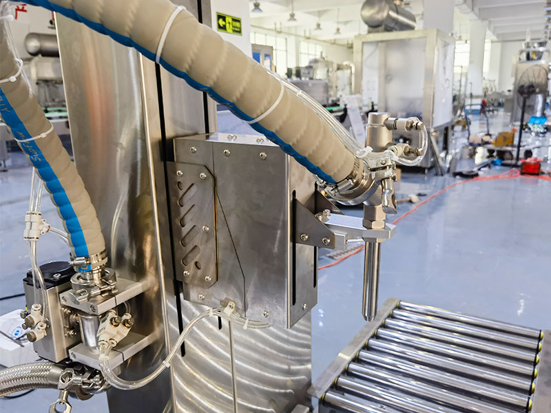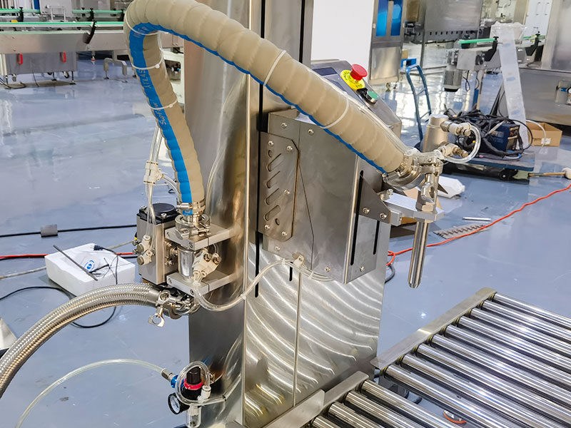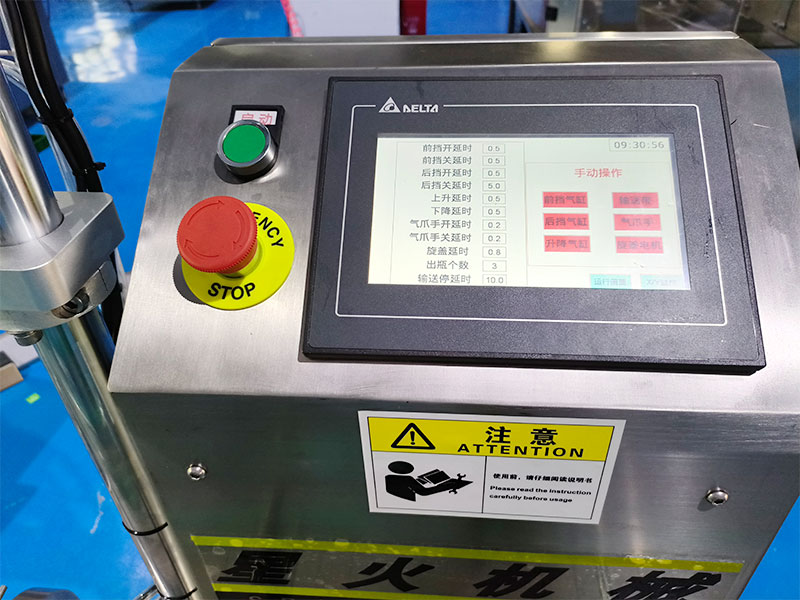 大型化工液體灌裝設(shè)備主要由自動(dòng)化控制系統(tǒng)執(zhí)行,工作人員將空桶防止在輸送帶上,開啟綠色灌裝按鈕,光電傳感裝置在檢測到灌裝桶到位時(shí),氣動(dòng)夾具自動(dòng)夾緊,系統(tǒng)開始自動(dòng)扣除空桶重量,進(jìn)行去皮處理,大型化工液體灌裝設(shè)備將會進(jìn)入灌裝準(zhǔn)備狀態(tài),灌裝頭開始插入容器桶內(nèi),打開防爆電磁閥,物料順著流入桶內(nèi),稱重感應(yīng)裝置將實(shí)時(shí)反饋重量信息的變化,便于工作人員查詢,PLC控制閥門將會實(shí)現(xiàn)快、慢速切換模式,以此達(dá)到灌裝精度的準(zhǔn)確,充填結(jié)束后,閥門關(guān)閉,灌裝頭回吸并提升,隨之進(jìn)入旋蓋工位,振動(dòng)盤則把需要封蓋的容器逐一上蓋,機(jī)械臂抓蓋,伺服旋蓋頭將按預(yù)設(shè)扭矩完成旋蓋任務(wù)。